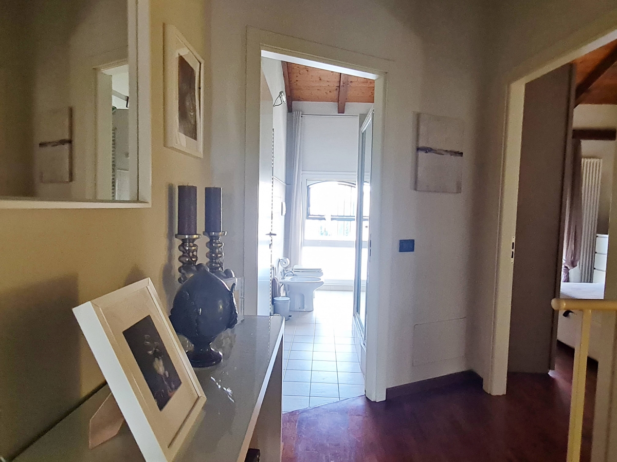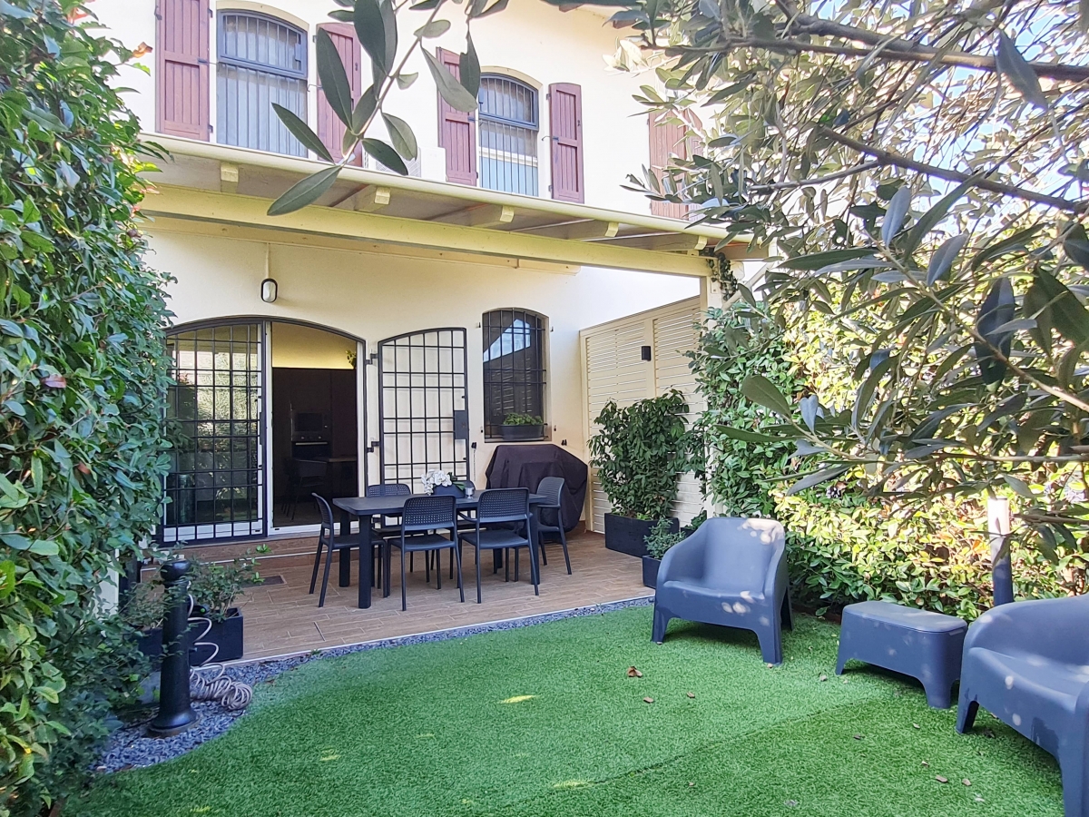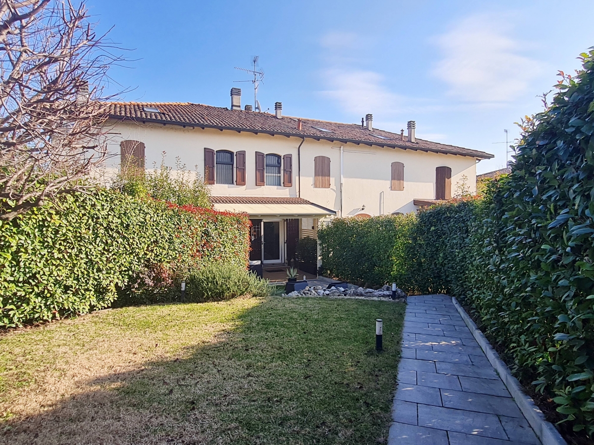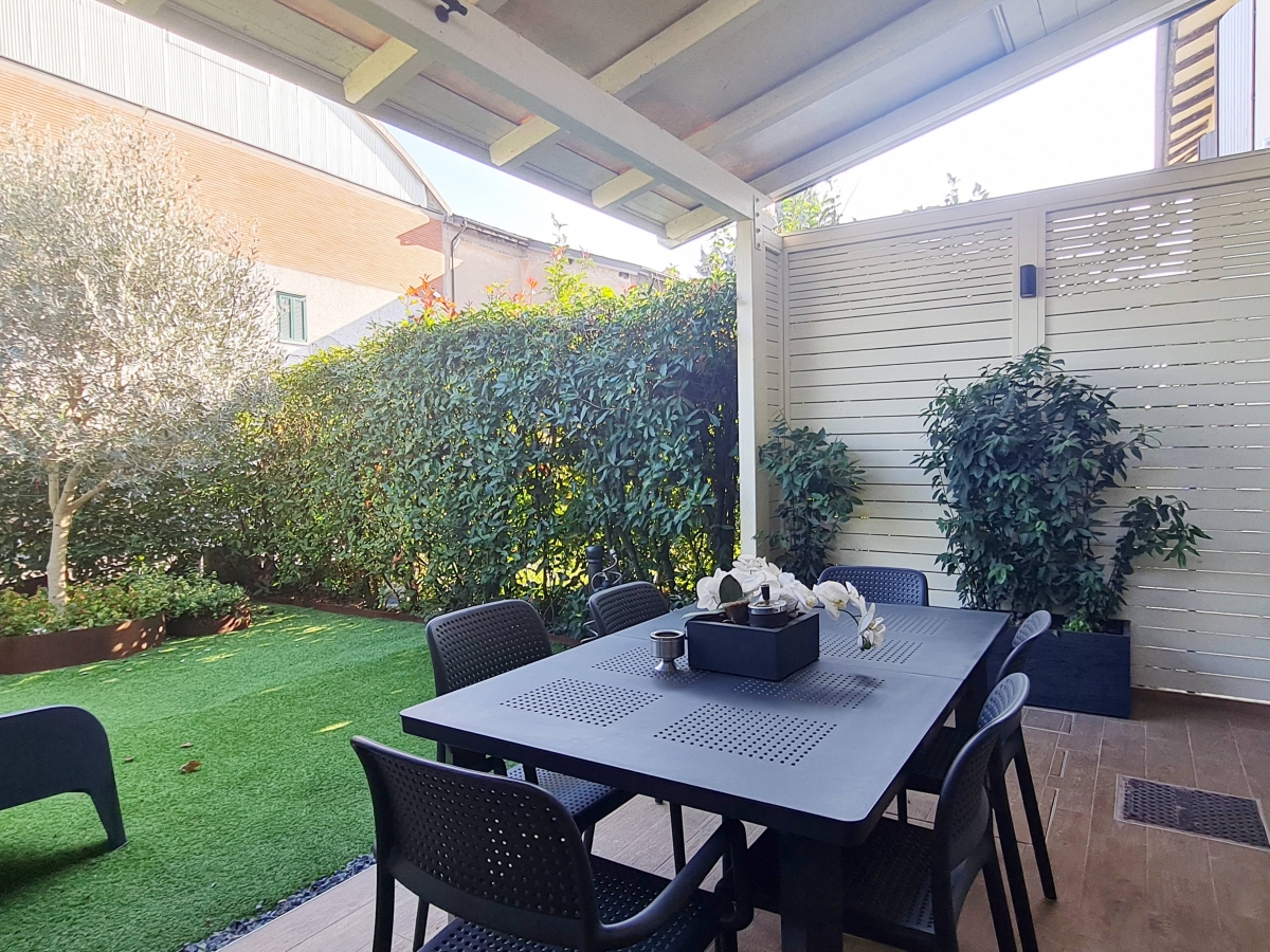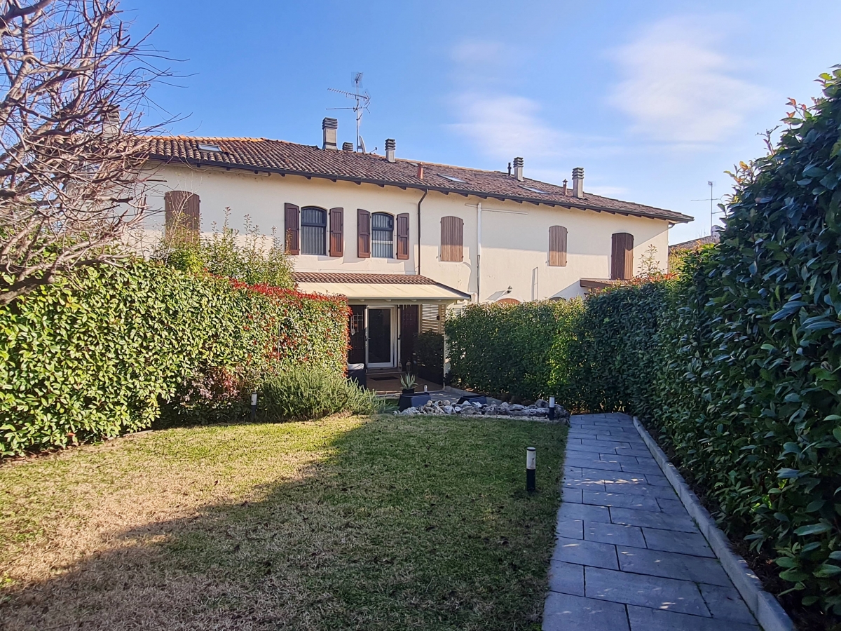 San Lazzaro di Savena – località Russo Tra la località Borgatella e la località Cicogna di San Lazzaro di Savena, a pochi minuti da tutti i servizi, nella tranquillità e nel verde, disponiamo di bellissima porzione di casa colonica con ingresso indipendente, posta su due piani, per mq 142, oltre a due pergolati e giardino privato posti sia sul fronte che retro di circa mq 250 totali. L’immobile è stato oggetto di totale recupero e totalmente ristrutturato alcuni anni fa con ottime finiture, per questo si presenta perfettamente tenuto e abitabile fin da subito. Attualmente così composto: Al piano terra ingresso diretto dal giardino con pergolato su ampia sala di rappresentanza con camino, disimpegno, bagno di servizio con angolo lavanderia, grande cucina abitabile con accesso al pergolato e al giardino sul retro. Il primo piano è collegato da una comoda scala in muratura dove si accede ad un disimpegno che porta ad un bagno finestrato con doccia, ad una camera da letto matrimoniale e ad una camera padronale su due livelli con cabina armadio attrezzata e bagno finestrato con vasca al primo livello, e camera da letto con altro vano accessorio al secondo livello. Il primo piano è caratterizzato dalle ampie altezze e volumi e dal soffitto in legno. Il giardino è perfettamente tenuto e arredato, include una casetta per il ricovero degli attrezzi, l’impianto di illuminazione e d’irrigazione. Al giardino fronte si accede da un cancello pedonale e da un cancello carraio automatico con possibilità di parcheggiare due posti auto. I pergolati sono stati recentemente pavimentati e attrezzati e sono dotati di frangisole in legno. Tutti gli scuri sono stati appena ricondizionati con garanzia decennale. Entrambi i giardini godono di un’ottima privacy dove è possibile trascorrere piacevoli giornate e ricevere ospiti. Le finiture interne sono di ottimo livello: Infissi di ottima fattura in alluminio bianchi con vetro camera, la porta d’ingresso e in vetro antisfondamento, inferriate ovunque, zanzariere, porte interne di colore bianco laccate, pavimenti in gres effetto pietra al piano terra e parquet al primo piano, aria condizionata, impianto d’allarme, termosifoni in alluminio tubolari bianchi e termo arredo nei bagni, impianti certificati. Durante la ristrutturazione, al piano terra è stato creato una camera d’aria perimetrale al piano terra per evitare la risalita dell’umidità. Sono disponibili altri due posti auto esclusivi all’interno dell’area comune alle altre unità immobiliari. L’immobile e libero subito e include gli arredi. € 378000