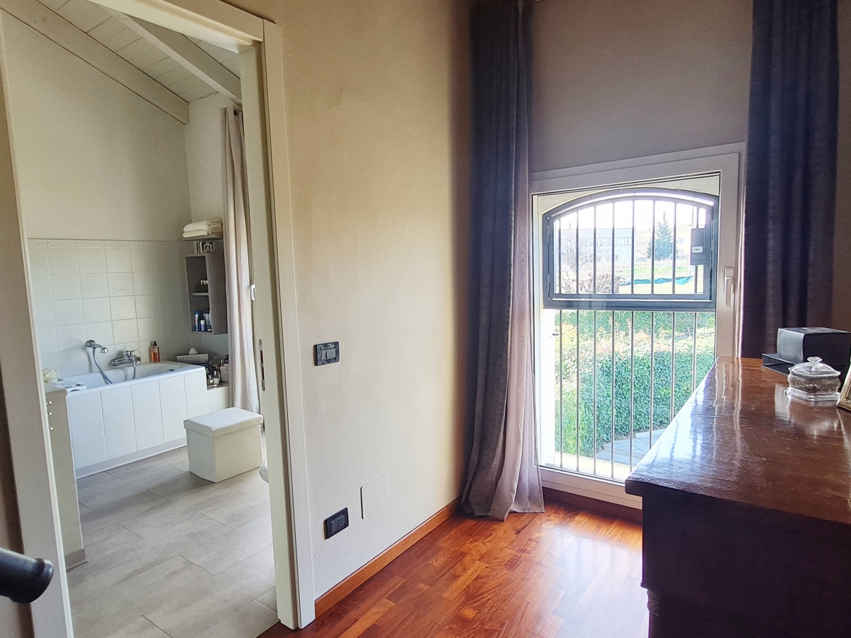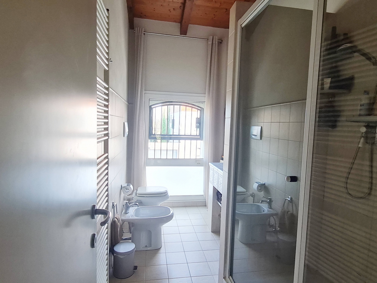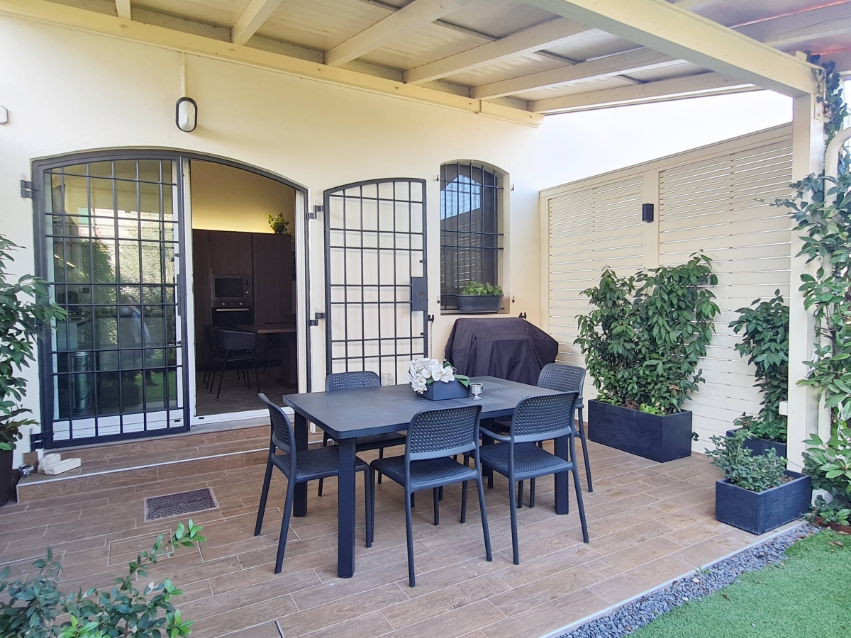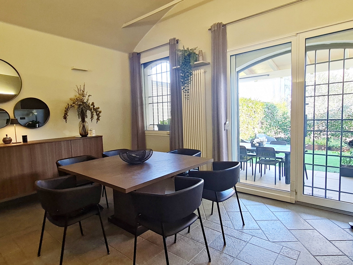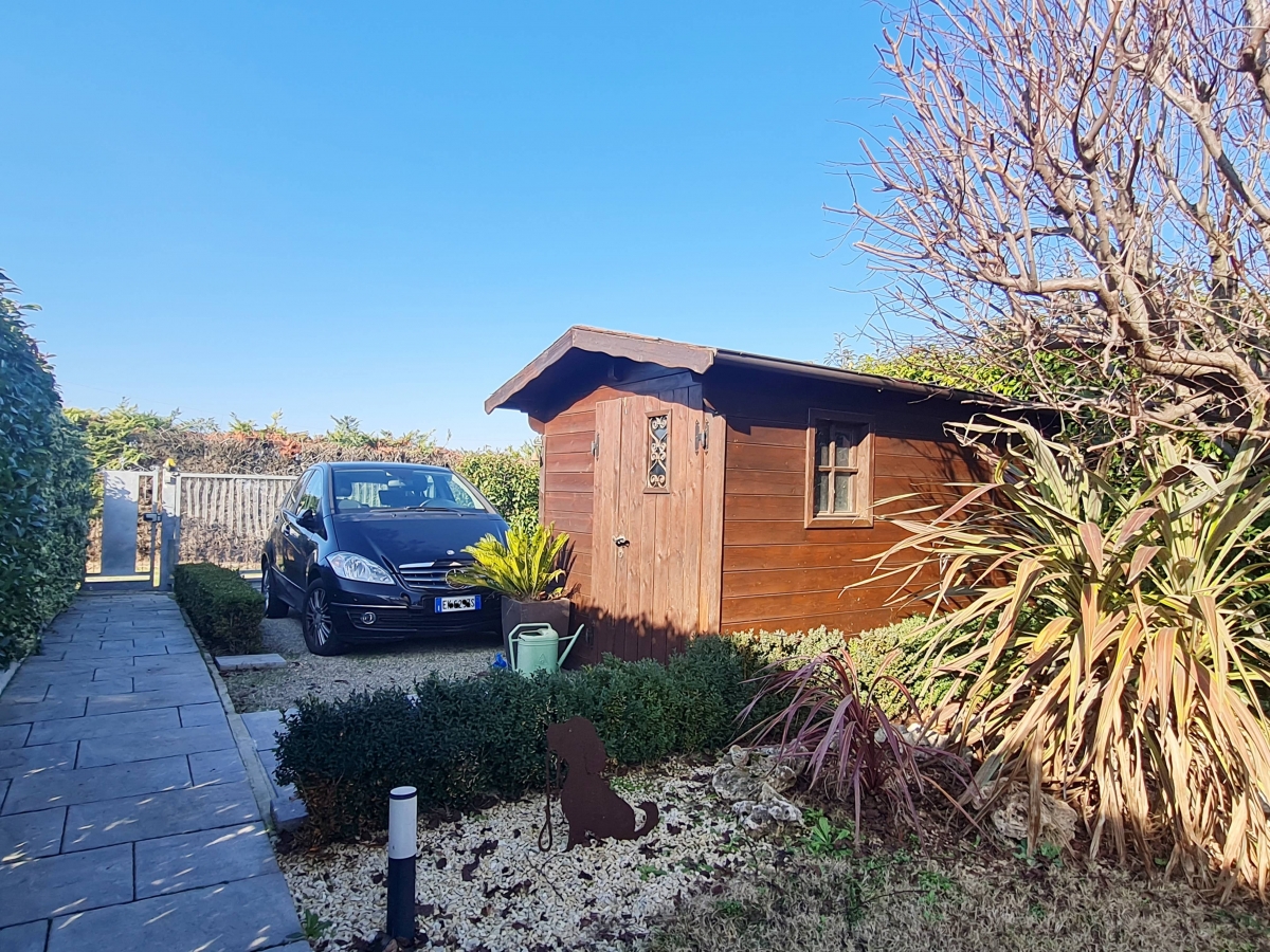 San Lazzaro di Savena – località Russo Tra la località Borgatella e la località Cicogna di San Lazzaro di Savena, a pochi minuti da tutti i servizi, nella tranquillità e nel verde, disponiamo di bellissima porzione di casa colonica con ingresso indipendente, posta su due piani, per mq 142, oltre a due pergolati e giardino privato posti sia sul fronte che retro di circa mq 250 totali. L’immobile è stato oggetto di totale recupero e totalmente ristrutturato alcuni anni fa con ottime finiture, per questo si presenta perfettamente tenuto e abitabile fin da subito. Attualmente così composto: Al piano terra ingresso diretto dal giardino con pergolato su ampia sala di rappresentanza con camino, disimpegno, bagno di servizio con angolo lavanderia, grande cucina abitabile con accesso al pergolato e al giardino sul retro. Il primo piano è collegato da una comoda scala in muratura dove si accede ad un disimpegno che porta ad un bagno finestrato con doccia, ad una camera da letto matrimoniale e ad una camera padronale su due livelli con cabina armadio attrezzata e bagno finestrato con vasca al primo livello, e camera da letto con altro vano accessorio al secondo livello. Il primo piano è caratterizzato dalle ampie altezze e volumi e dal soffitto in legno. Il giardino è perfettamente tenuto e arredato, include una casetta per il ricovero degli attrezzi, l’impianto di illuminazione e d’irrigazione. Al giardino fronte si accede da un cancello pedonale e da un cancello carraio automatico con possibilità di parcheggiare due posti auto. I pergolati sono stati recentemente pavimentati e attrezzati e sono dotati di frangisole in legno. Tutti gli scuri sono stati appena ricondizionati con garanzia decennale. Entrambi i giardini godono di un’ottima privacy dove è possibile trascorrere piacevoli giornate e ricevere ospiti. Le finiture interne sono di ottimo livello: Infissi di ottima fattura in alluminio bianchi con vetro camera, la porta d’ingresso e in vetro antisfondamento, inferriate ovunque, zanzariere, porte interne di colore bianco laccate, pavimenti in gres effetto pietra al piano terra e parquet al primo piano, aria condizionata, impianto d’allarme, termosifoni in alluminio tubolari bianchi e termo arredo nei bagni, impianti certificati. Durante la ristrutturazione, al piano terra è stato creato una camera d’aria perimetrale al piano terra per evitare la risalita dell’umidità. Sono disponibili altri due posti auto esclusivi all’interno dell’area comune alle altre unità immobiliari. L’immobile e libero subito e include gli arredi. € 378000